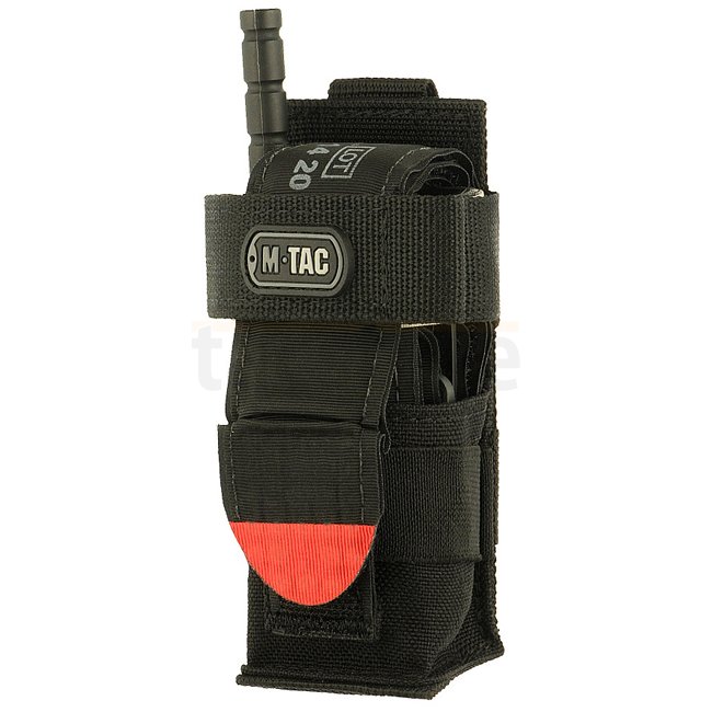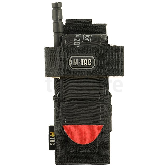 Afin de tenir dans la pochette, le garrot d'application de combat doit être plié en position "escargot". Le système de fixation modulaire vous permet d'installer la pochette sur des surfaces MOLLE, ainsi que sur des gilets et des ceintures.