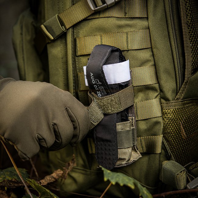 Afin de tenir dans la pochette, le garrot d'application de combat doit être plié en position "escargot". Le système de fixation modulaire vous permet d'installer la pochette sur des surfaces MOLLE, ainsi que sur des gilets et des ceintures.