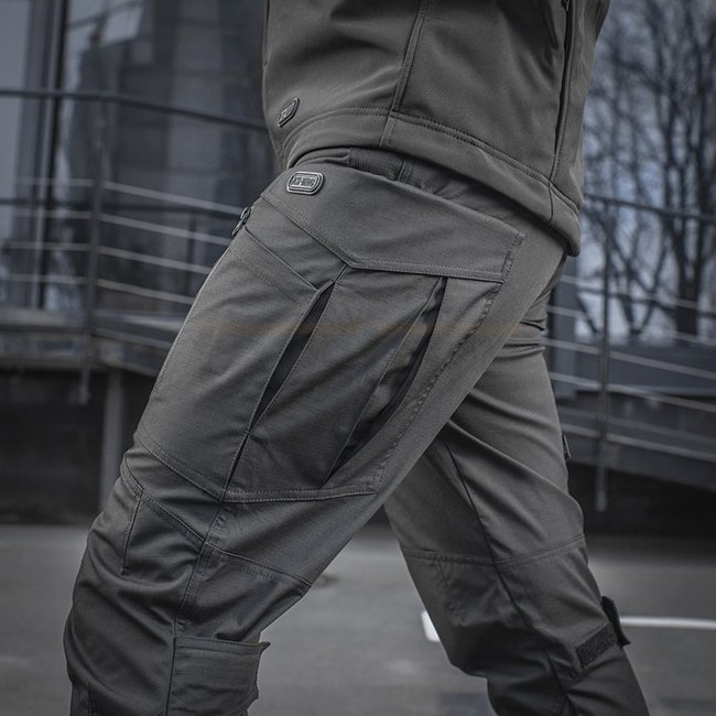 Les caractéristiques de conception du pantalon Conquistador Flex sont un insert élastique à la taille et près des poches latérales, grâce auquel le pantalon ne vous limite pas lorsque vous vous penchez ou vous penchez. Ils n'entravent pas la liberté de mouvement et vous pouvez les porter aussi bien comme vêtements tactiques que comme vêtements de tous les jours. Le pantalon a une fermeture éclair et un bouton, il est également équipé de passants pour une ceinture jusqu'à 5,5 cm de large. Deux anneaux en D sont cousus à l'avant pour attacher divers équipements. Le pantalon Conquistador Flex est équipé d'un grand nombre de poches, à la fois utilitaires et spéciales : il y a huit poches au total. Les poches latérales standard sont équipées d'un renfort en bas - pour attacher un clip de couteau ou une lampe de poche au bord de la poche. La poche cargo complexe est équipée d'une poche plaquée supplémentaire, qui peut accueillir un chargeur M4 ou AK. La poche cargo elle-même est assez spacieuse. Il a deux plis, grâce auxquels sa taille peut être augmentée pour transporter des objets volumineux. La poche cargo est fermée par un rabat velcro asymétrique à ouverture rapide. De plus, la poche cargo est équipée d'une deuxième entrée zippée, ce qui vous permet d'accéder à son contenu depuis une position assise.