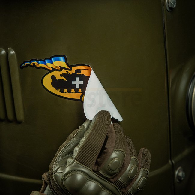 L'autocollant a une forme ovale avec l'image d'un réservoir avec une croix blanche dessus. Les véhicules des Forces armées ukrainiennes passent à l'offensive précisément avec un signe en forme de croix blanche. Ce symbole a une base historique et une signification sacrée pour le peuple ukrainien. Selon une explication, la croix équilatérale est considérée comme la bannière des Cosaques et la bannière de la victoire. Une croix similaire était l'un des éléments des armoiries du fondateur du Zaporozhian Sich, Dmytro-Bayda Vyshnevetskyi, Hetman Bohdan Khmelnytskyi, et était également représentée sur les drapeaux de divers régiments de l'armée de Zaporozhian.