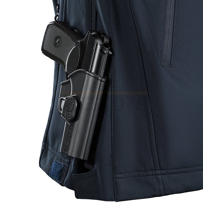La veste Soft Shell est composée d'une membrane intercalaire en polyuréthane qui protège des intempéries. À l'intérieur, il a une fine couche de polaire. Il dispose de deux panneaux d'identification qui, selon la situation, peuvent être retirés ou rester cachés. Les panneaux vides peuvent être imprimés ou emproided. Un système d'ouverture latérale permet un accès rapide à une arme latéral.