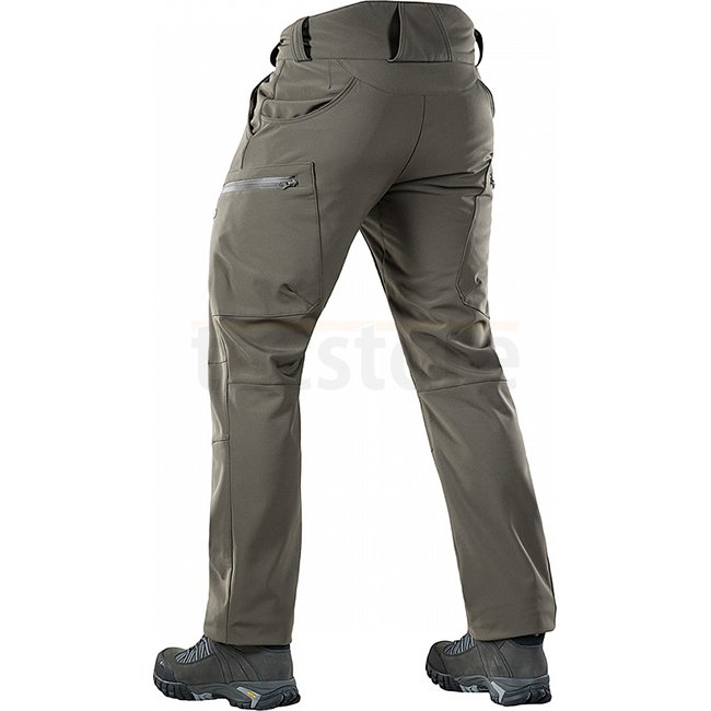 Pantalons d'hiver Soft Shell M-Tac - Olive - L. Les pantalons parfaits pour la saison intermédiaire et l'hiver grâce à une combinaison d'isolation en polaire et de robustesse de la couche extérieure. Idéal pour bloquer le vent et évacuer l'humidité. Carac