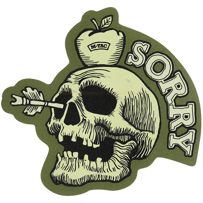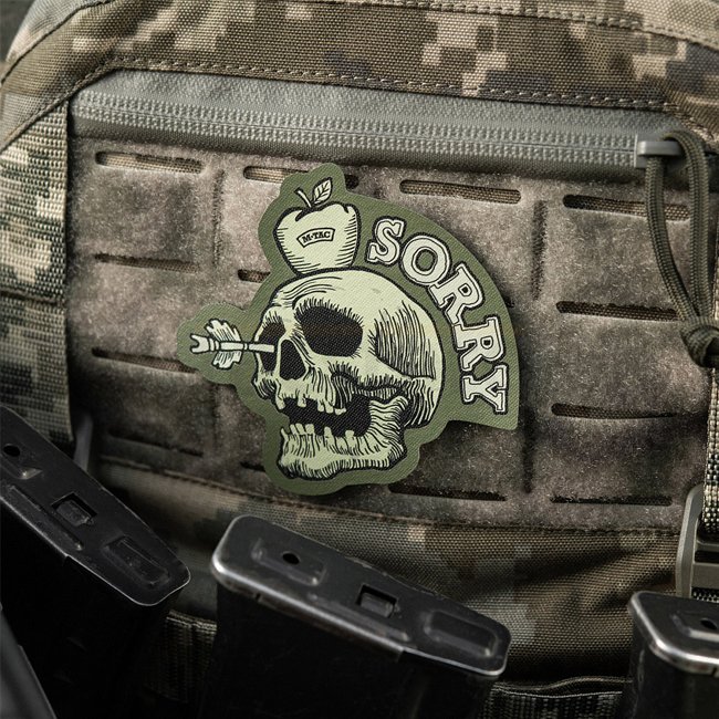 Écusson M-Tac SORRY en vert ranger, fabriqué en Oxford 190g/m à l'avant et matériel de surface Hook à l'arrière. Mesure 83 x 85 mm.