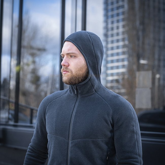 Fabriqué en polaire Polartec 200 de qualité supérieure. Ce matériau est durable et agréable au corps, retient bien la chaleur et ne bouloche pas. Le col haut de la capuche protège efficacement du froid et du vent. Les manches raglan sont spécialement coupées pour le confort et la liberté de mouvement. Cette coupe permet d'obtenir une forme d'épaule inhabituelle, résultant en une silhouette élégante et arrondie. Les coutures plates garantissent le confort et ne frottent pas.