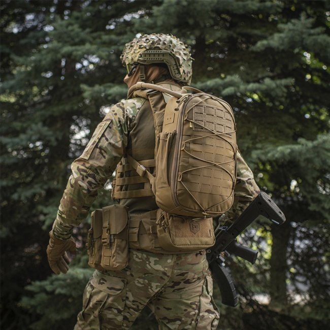 A l'intérieur il y a un compartiment pour un système d'hydratation, et en haut il y a une ouverture pour son tube. Sur le rabat du sac à dos se trouvent deux poches en filet, idéales pour ranger des accessoires EDC. L'avant du sac à dos est équipé d'un système MOLLE Laser Cut, fabriqué en Cordura 500D, qui permet d'attacher du matériel supplémentaire.