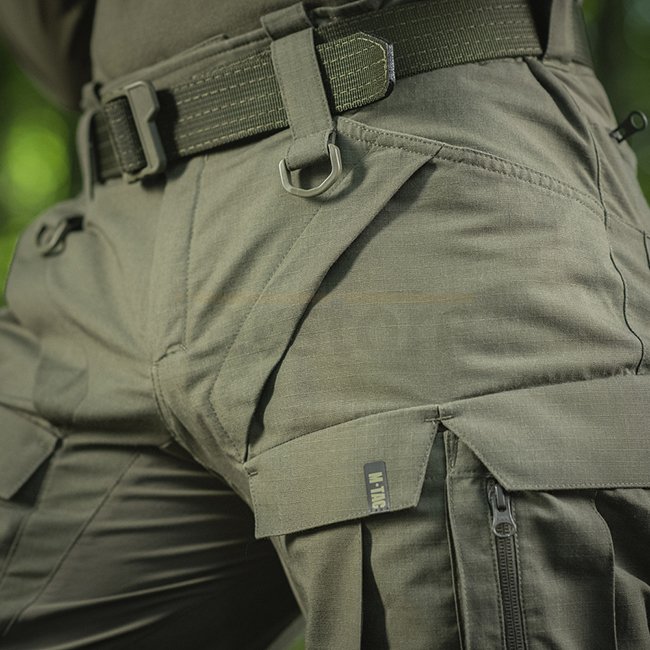 La ceinture du pantalon est réglable à l'aide de sangles en toile, et il est conçu pour être porté avec une ceinture jusqu'à 5,5 cm de large. Il y a deux anneaux en D à l'avant pour attacher divers équipements. La largeur de la zone des genoux est réglable à l'aide de velcro. Un cordon élastique est tendu le long du bord inférieur du pantalon et des fermetures velcro permettent d'ajuster la taille.