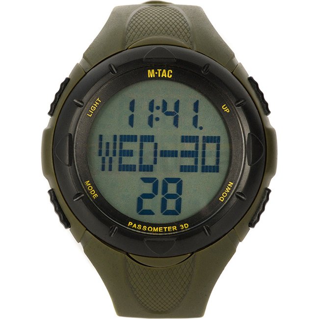 M-Tac Montre Tactique & Podomètre - Olive. Un excellent choix pour le sport et les activités en plein air. Compteur de pas, traqueur de distance, compteur de calories, alarmes, chronomètre, minuterie. Résistant à l'eau WR50.