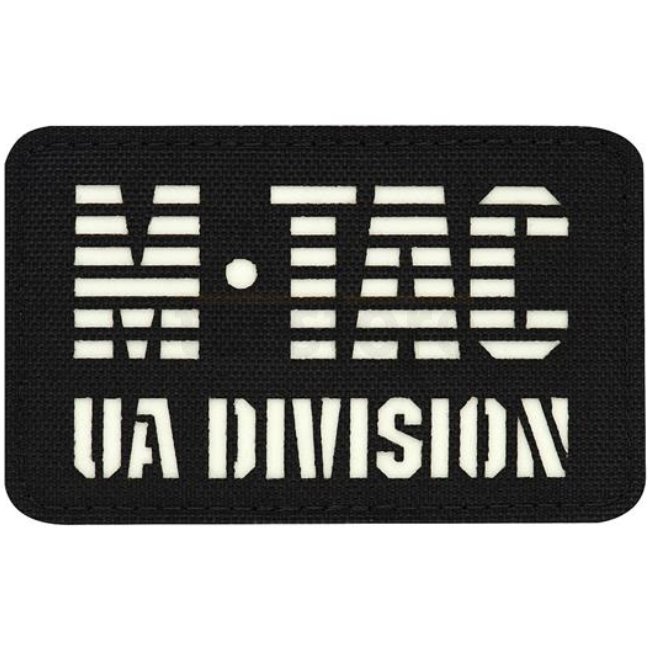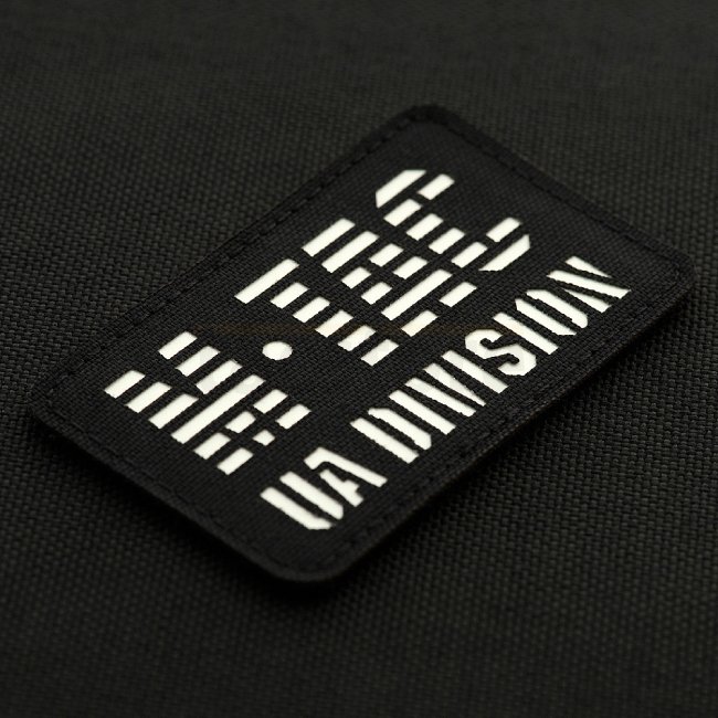 M-Tac UA Division Découpe Laser Patch GID - Noir, fabriqué avec du Cordura 500D et un matériau emmagasinant la lumière à l'avant, et une surface à crochet à l'arrière. Dimensions : 80 x 50 mm.