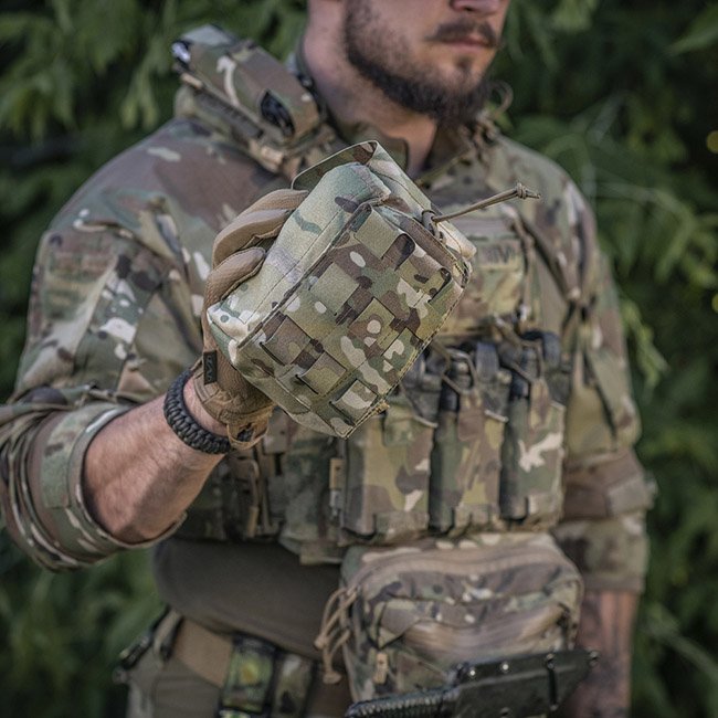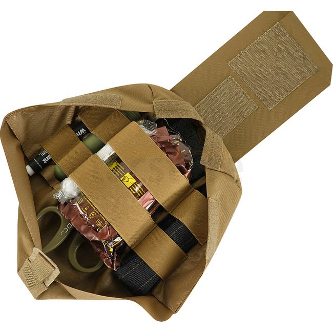 La pochette extérieure est en Cordura 500D - un matériau durable qui résiste à l'abrasion et aux charges élevées. Les parois latérales intérieures sont en nylon élastique, grâce auquel il conserve sa forme. Un élément de fixation supplémentaire est une sangle qui vous permet de maintenir en toute sécurité la trousse de premiers secours, même pendant l'activité. Se fixe à l'équipement à l'aide de l'interface MOLLE.