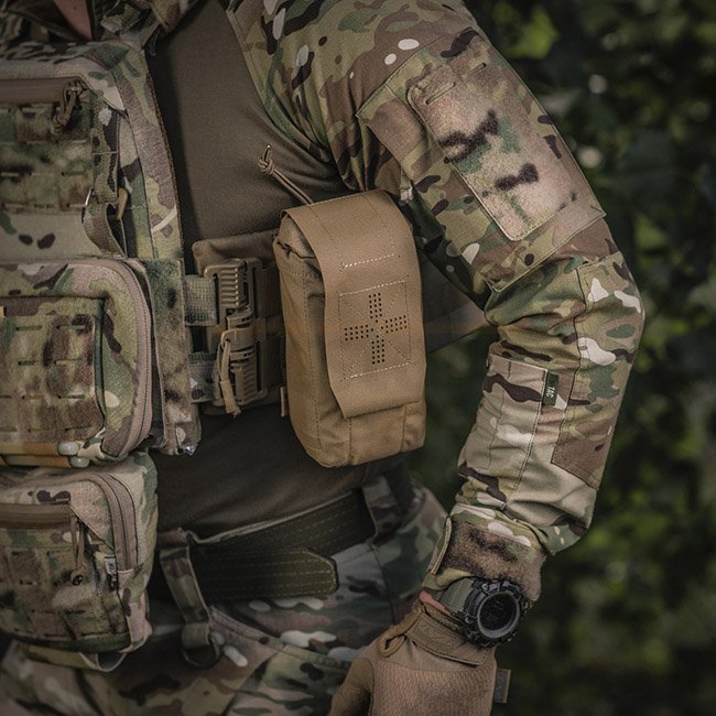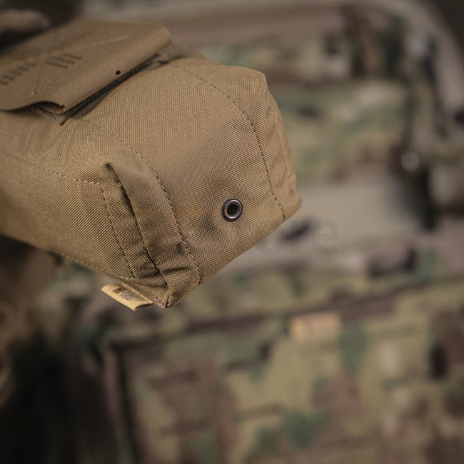 La pochette extérieure est en Cordura 500D - un matériau durable qui résiste à l'abrasion et aux charges élevées. Les parois latérales intérieures sont en nylon élastique, grâce auquel il conserve sa forme. Un élément de fixation supplémentaire est une sangle qui vous permet de maintenir en toute sécurité la trousse de premiers secours, même pendant l'activité. Se fixe à l'équipement à l'aide de l'interface MOLLE.