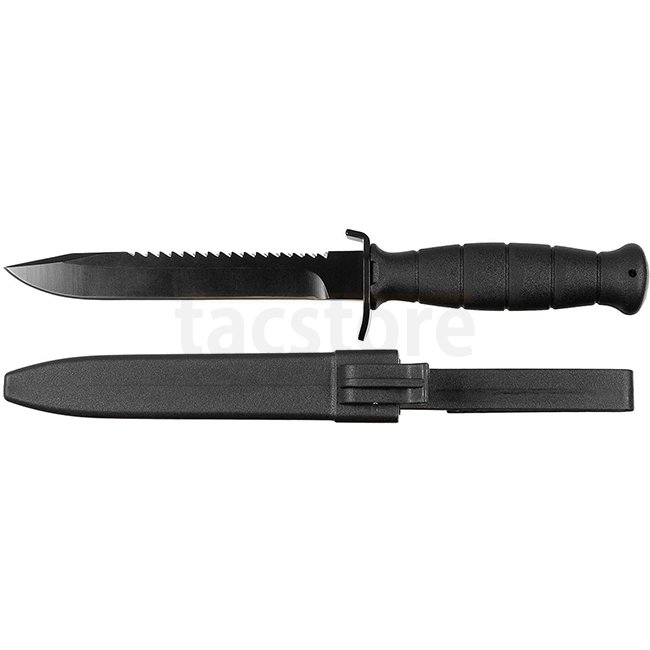 Un couteau d'extérieur polyvalent avec une lame noircissante, un bord lisse, un dos de scie et un protège-main avec ouvre-bouteille. Il dispose d'un manche en plastique avec œillet de fixation et d'une gaine en plastique avec fermeture à clic pour une com