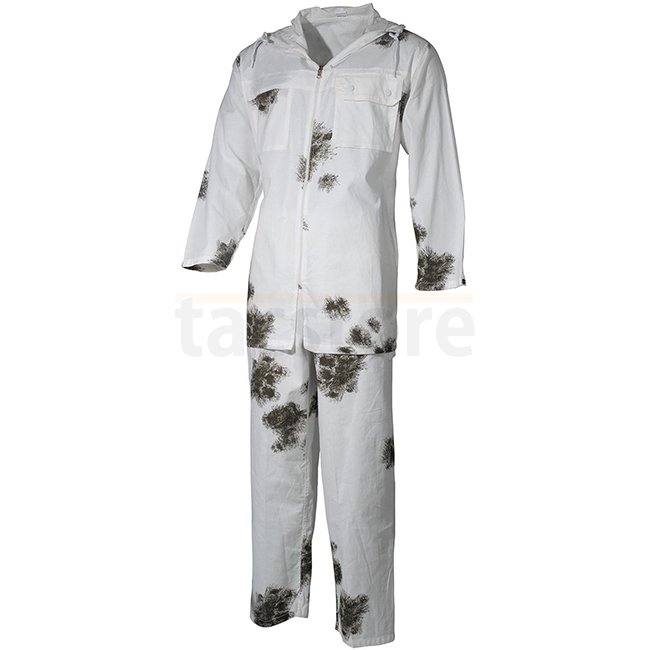 Costume de camouflage MFH BW - Camouflage neige - L/XL : Veste et pantalon réversibles en blanc et camouflage neige, avec fermeture éclair à l'avant, poche poitrine, capuche, manches réglables, taille avec cordon de serrage, braguette, fausses poches et f