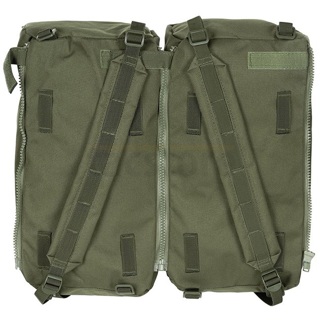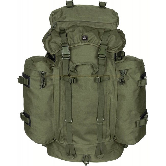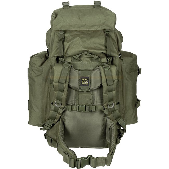 Sac à dos de montagne MFH BW - Olive : Bretelles réglables et rembourrées, SYSTÈME VARIO-BACK pour ajustement en hauteur, cadre en aluminium, multiples poches, sacs latéraux détachables, capacité 80L.
