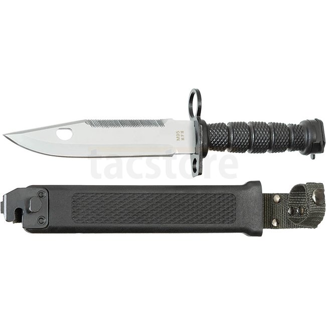 MFH CN Baïonnette M95 - Noir : Baïonnette pour le fusil d'assaut type 95 de l'armée chinoise, lame en acier avec dos de scie, fonction de coupe de fil, poignée en plastique, garde en métal et étui avec pierre à aiguiser. Longueur totale : env. 30 cm.