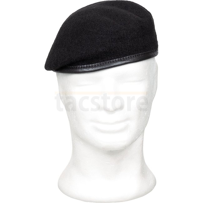 Béret Commando MFH en Noir - taille 62. Béret commando français avec style allemand, fabriqué en 100% laine extérieure, doublé de 100% polyester, comportant un bord en cuir avec cordon de serrage et 2 œillets de ventilation. Style petit et plat pour un c