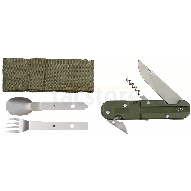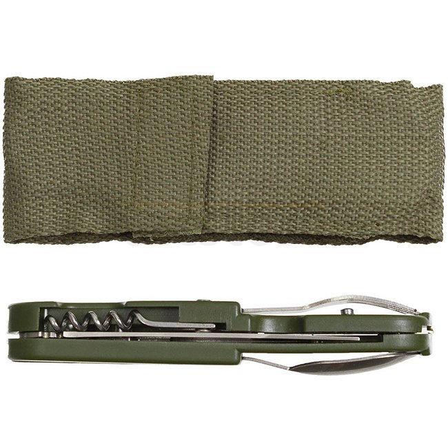 Set de couverts pliable MFH - Olive : Couteau, fourchette, cuillère, ouvre-boîte/bouteille, tire-bouchon, étui en nylon avec boucle de ceinture et clip de ceinture. Taille du paquet : env. 15 x 5 x 3 cm. Aucune exportation vers la France !