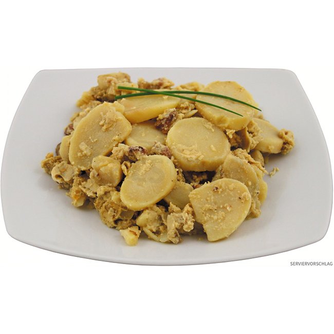 Des ingrédients indigène Artisanalement fabriqué à Allemagne Sans agent de conservation et exhausteurs de goût Sans aucun traitement de viande séparée Non refroidi 10 ans conservable !!! Stocker au sec et température ambiante Sans gluten Ingrédients : 75% pomme de terre, 10% lard, 10% uf /lait, oignon, sel gemme, poivre, sucre indication de pourcentage au moment de l'utilisation Valeur nutritives pour 100g: Valeur calorique physiologique 435 kJ ,104 kcal Graisse 4,77g, acide gras saturé 1,39g Glucides 12,16g, le sucre 0,81g Protéine 2,79g, sel 0,54g 01/2031