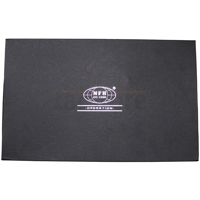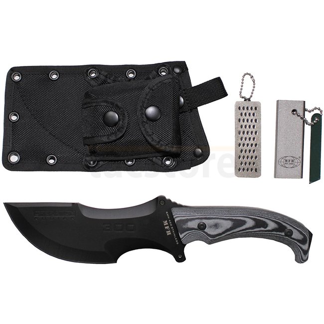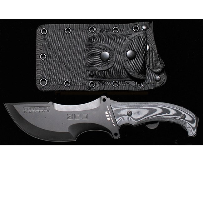 Couteau MFH Operation Kodiak - Noir : Lame courbée noire, garde doigts, poignée en Micarta, étui en nylon avec pochette, pierre à aiguiser et démarreur de feu. Épaisseur de la lame : 6mm, Acier 420. Longueur totale : 30cm. Lame : 17cm. Poids du couteau :