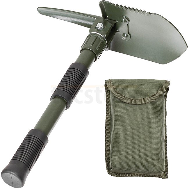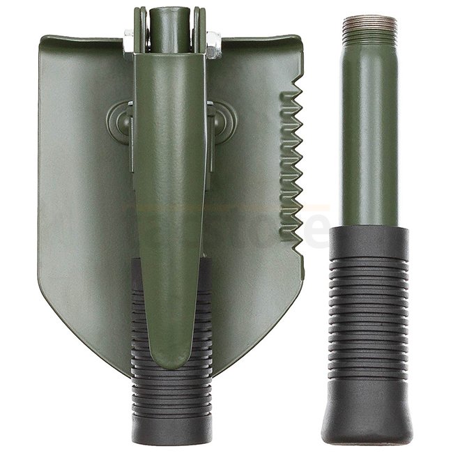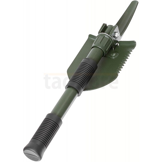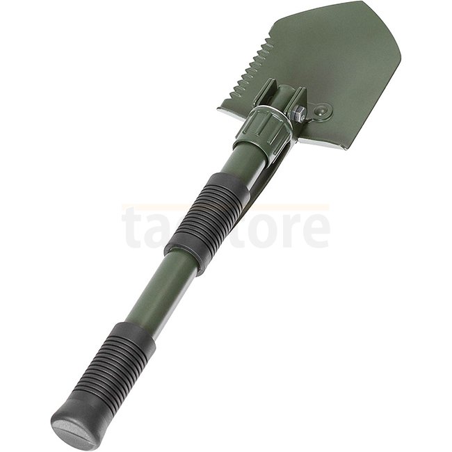 Ensemble de pelle pliante mini MFH compact en couleur olive avec une lame à bord denté, un pic à main repliable, un revêtement en caoutchouc antidérapant et un étui de transport. Taille de la lame : env. 13 x 9,5 cm. Longueur totale : env. 41 cm. Taille d