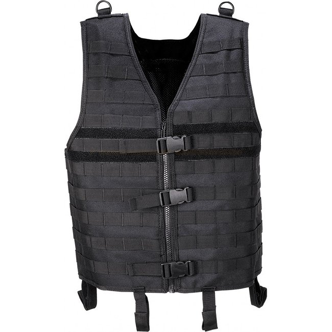 Gilet Tactique MFH MOLLE Light - Noir : Gilet tactique avec système modulaire, fermeture éclair durable avec fermeture à clip, ajustable sur l'épaule, boucles Molle, panneaux velcro, poignée de secours, 6 boucles de ceinture, 3 poches intérieures. 100% Po