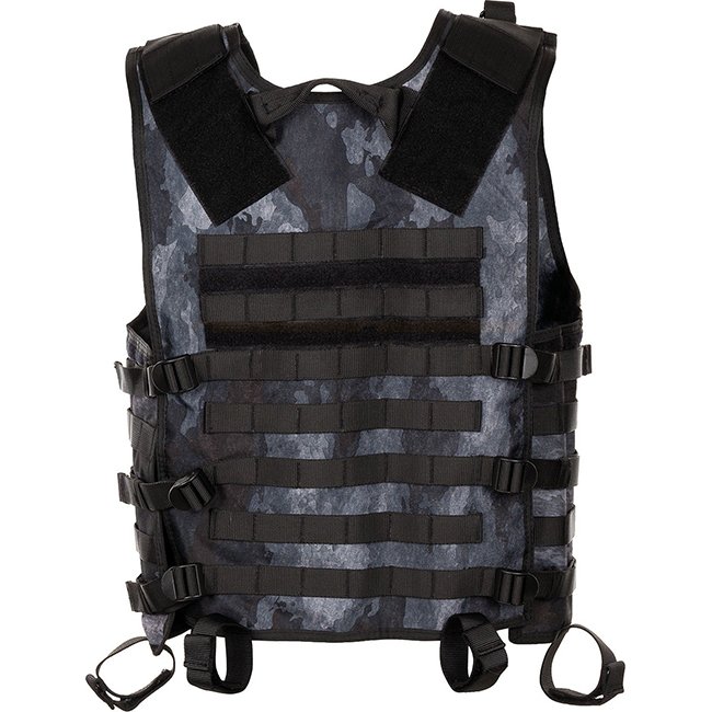 Gilet tactique avec système modulaire, réglable en hauteur sur l'épaule, boucles d'attache Molle, panneaux velcro, poignée de sauvetage, 6 boucles sur la ceinture, 3 poches en filet. 100% Polyester.