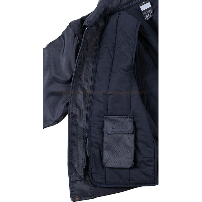 Veste Bomber MFH SECURITY en bleu, dotée d'une fermeture éclair frontale cachée, de 2 poches passepoilées, d'une poche sur la manche attachée avec zip et poches pour stylos, de poches intérieures à patch avec velcro, de manches zippées, de patchs amovible
