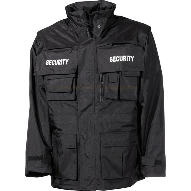 Parka MFH SECURITY Imperméable - Noir - M : Parka résistant à l'eau, réglable avec plusieurs poches, zips dissimulés et manches amovibles. Design polyvalent pour différentes conditions météorologiques.