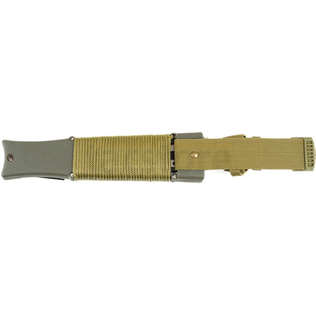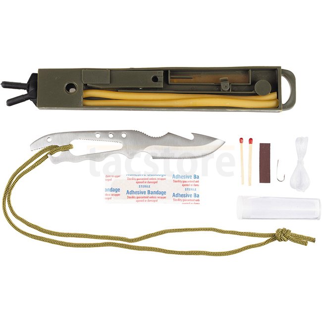 couteau de survie universaliste et robuste lame avec dent de scie pare-main poignée antiglissant, fabriqué d'aluminium avec une cordolette kit de survie dedans la poignée: boussole, allumettes, hameçon et ligne pansement adhésif, cordolette case additionelle dans le fourreau avec mutlitool (couteau, crochet d'arrêt, ouvre-boîte, etc.) outre du latex pour poser un garrot ou pour une fronde prise en main utilisable pour une fronde envers de la case être situé d'échelle de mesure et miroir de signal fourreau de plastique avec prise en main dépliant pour une fronde cordolette périphérique fixage à ceinture Longueur: env. 35,5 cm Lame: env. 20,5 cm |