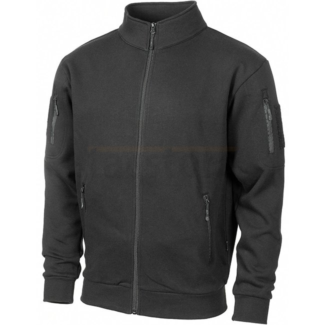 Veste tactique MFH en couleur noire, taille 2XL. Fermeture éclair avant, poignets et taille en tricot, col montant. 2 poches latérales avec fermeture éclair, 2 poches sur les bras supérieurs avec fermeture éclair et port pour écouteurs. Panneaux velcro at