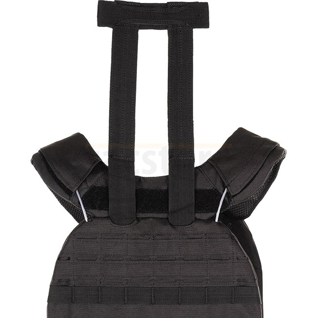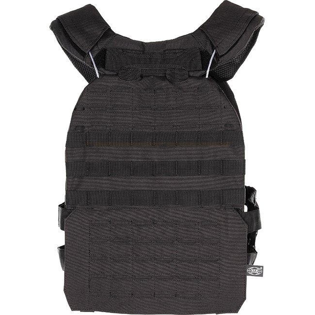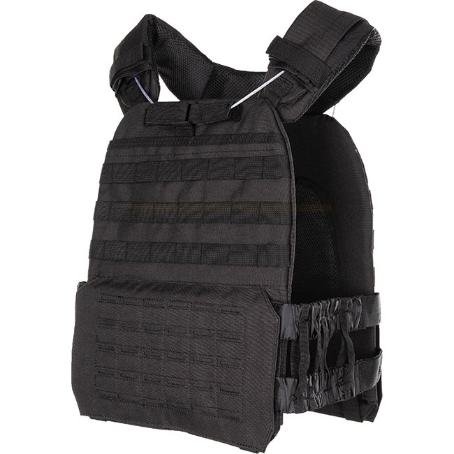 Gilet tactique noir de haute qualité avec design découpé au laser. Léger, rembourré et ajustable pour le confort. Boucles d'attachement Molle, poignée de sauvetage extensible et emplacements pour les protecteurs. Fabriqué en 100% Polyester.