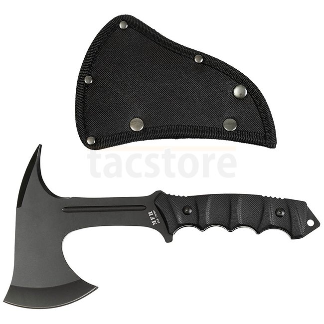 MFH Tomahawk Comox - Noir : Lame de surface noircie avec bord lisse, un côté utilisable comme pic. Plaques de prise ergonomiques en matériau G10. Œillet à l'extrémité du manche. Étui en polyester avec boutons-pression et boucle de ceinture. Longueur total