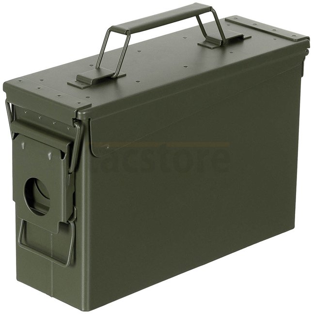 Boîte à munitions en métal résistant aux éclaboussures de couleur olive avec couvercle amovible, joint en caoutchouc et poignée de transport repliable. Dimensions externes : 27,9 x 9,2 x 18,4 cm. Dimensions internes : 25,5 x 8,8 x 16,5 cm. Légère à 1,7 kg