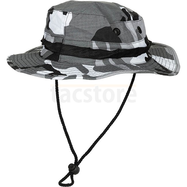 MFH US Boonie Hat Ripstop - Camo Urbain - M est un chapeau élégant et fonctionnel doté d'un bord multi-matelassé, de boucles circonférentielles, de 4 œillets de ventilation avec du mesh, et d'une jugulaire avec un arrêt de cordon. Fabriqué en matière 100%