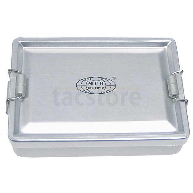 Boîte en aluminium étanche MFH - Boîte en aluminium étanche avec joint en caoutchouc, fermeture latérale, et poignée polyvalente. Dimensions 13,3 x 9,2 x 3,4 cm, poids environ 100 g.