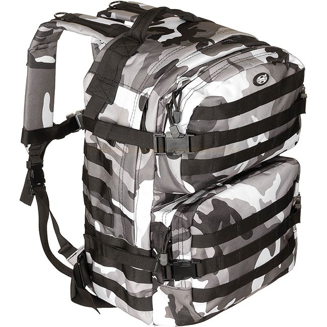 Sac à dos MFHHighDefence US Assault 2 - Camouflage Urbain : Bretelles rembourrées ajustables, sangles de poitrine et de taille détachables, matériau en maille respirante, compartiment pour poche d'hydratation, plusieurs poches, boucles d'attache Molle. Ca