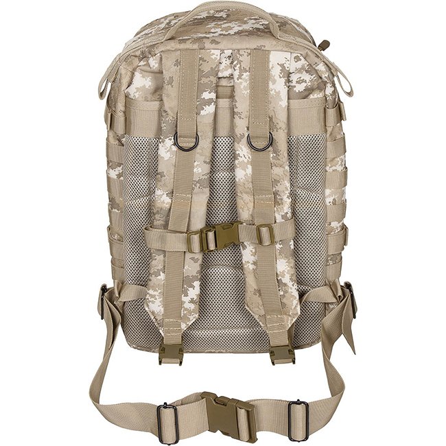 Sac à dos MFHHighDefence US Assault 2 - Désert Vegetato avec bretelles rembourrées réglables, sangles de poitrine et de taille détachables, dos rembourré en maille respirante, compartiment pour poche d'hydratation, boucles d'attache Molle, et capacité de