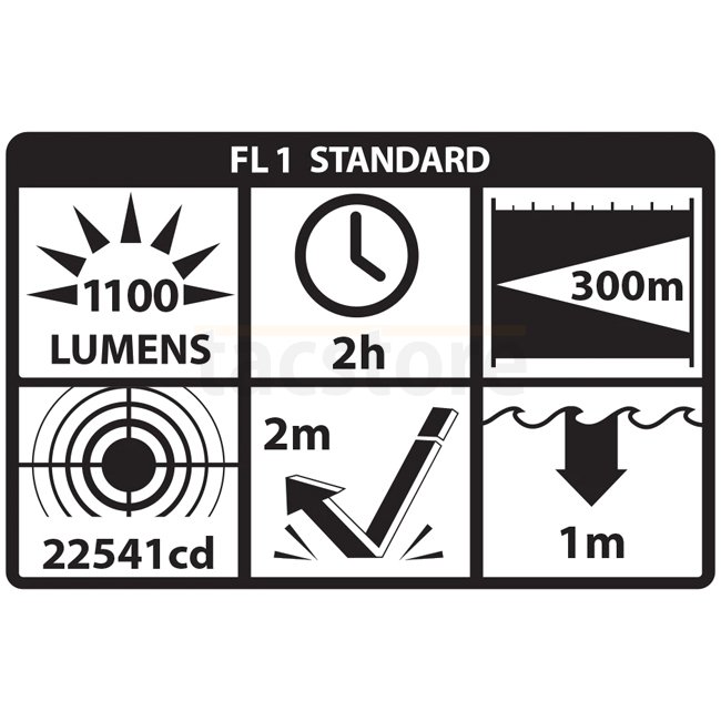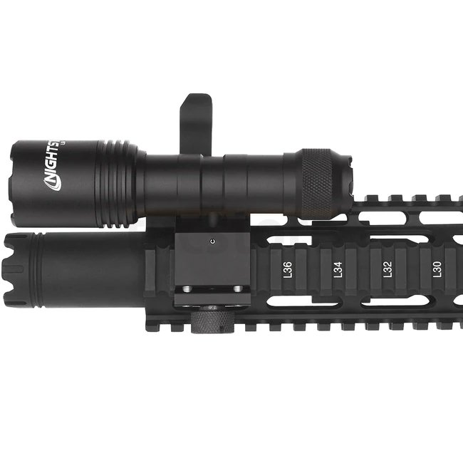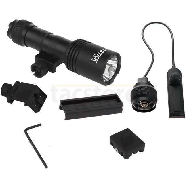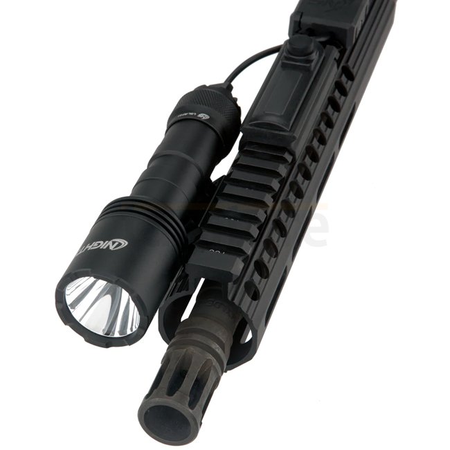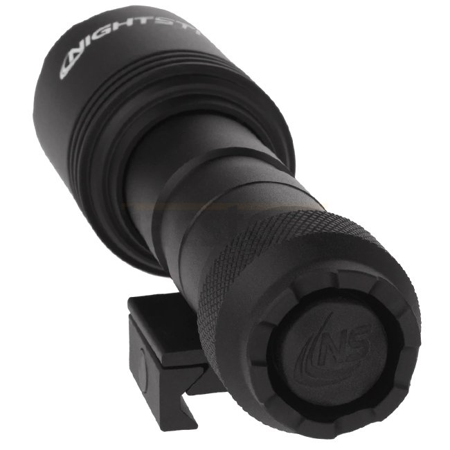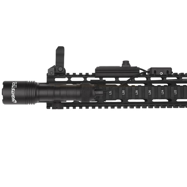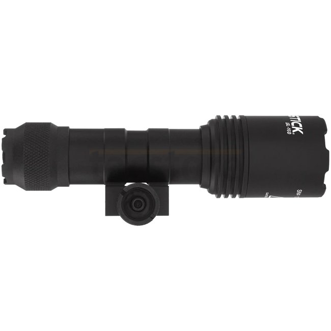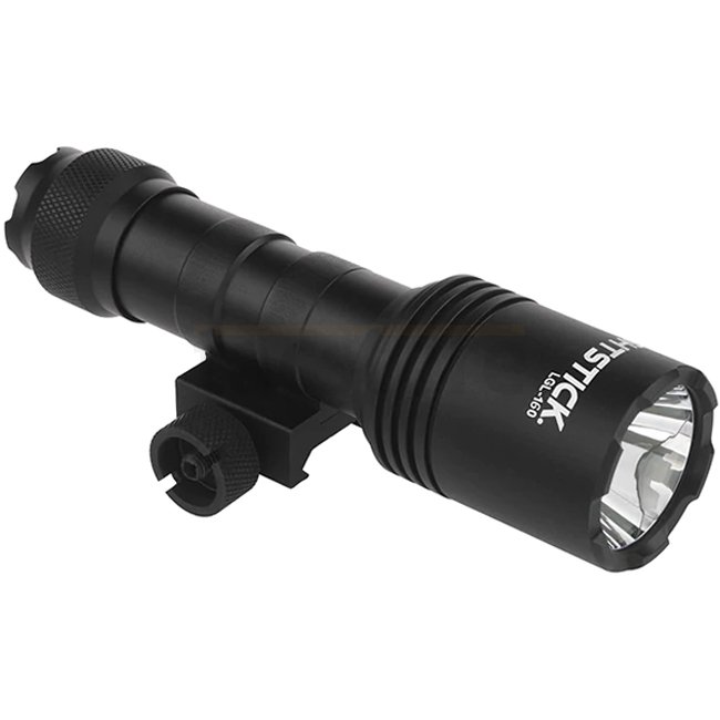 Lampe Nightstick LGL-160 en couleur noire avec une puissance de 1100 lumens, autonomie de 2 heures, portée de 300 mètres, boîtier IPX-7, système Picatinny, source lumineuse LED, alimentée par 2 piles CR123. Dimensions compactes de 135 x 36 x 23 mm et légè