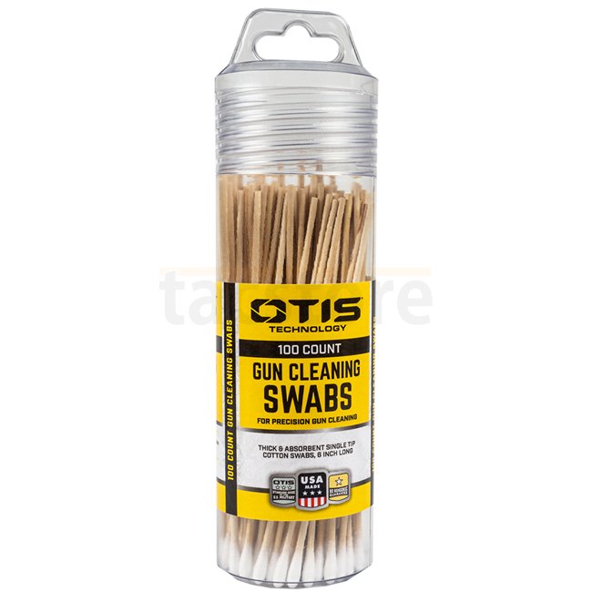 Tampons de nettoyage pour armes à feu Otis de haute qualité avec un tampon en coton sur un manche en bois de 15 cm. Élimine facilement les résidus et les encrassements. Paquet de 100 dans un tube réutilisable.