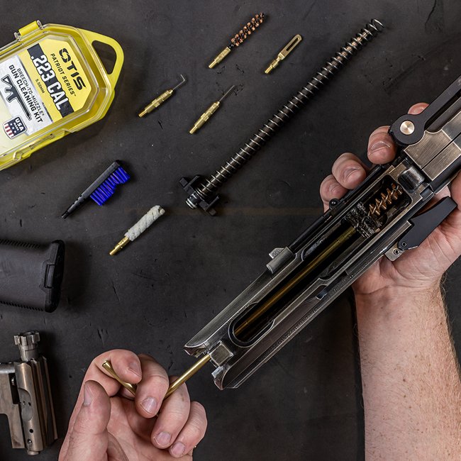 Kit de nettoyage spécialement conçu pour les carabines de calibre .223/5,56mm rangé dans un étui rigide mesurant 22 x 13 x 4 cm. Fabriqué aux USA.