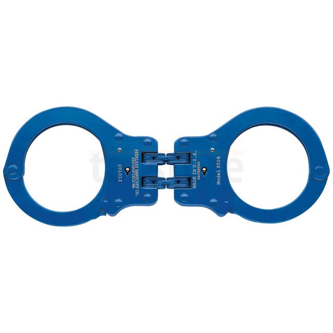 Menottes articulées Peerless Modèle 850C - Bleu avec un mécanisme de verrouillage amélioré pour plus de durabilité. Restreint efficacement les mouvements des mains/bras, se plie à plat pour le rangement. Revêtement EPP résistant au décollement et aux rayu