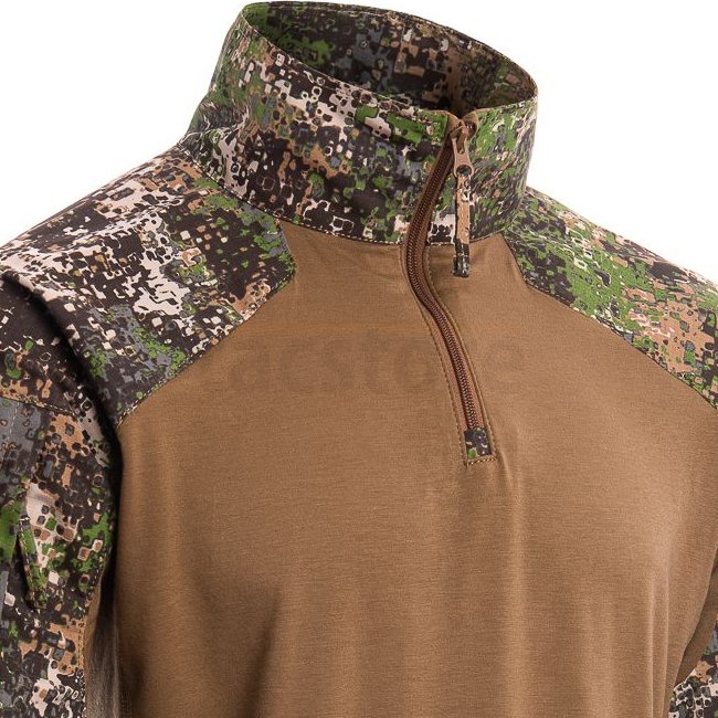 Grâce à sa conception compacte et à ses matériaux de haute qualité, l'Advanced Combat Shirt avec sa coupe moderne peut résister aux conditions d'utilisation les plus difficiles. Un col mi-haut protège contre les débris et les coquillages. Grâce à sa coupe ajustée, il n'interfère pas avec le port d'un porte-plaque. Il en va de même pour la fermeture à glissière utilisée, très plate au niveau de la poitrine et dotée de deux rabats de protection au niveau du menton, ce qui évite de blesser le porteur lors de sa fermeture. Pour éviter les points de pression inutiles, toutes les coutures sont maintenues à plat.