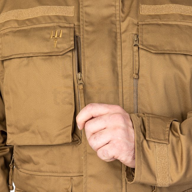 • Poches sur les Bras: Deux poches sur les bras, accessibles par des rabats supérieurs ou des fermetures éclair latérales, recouvertes de Velcro pour attacher des Patches.