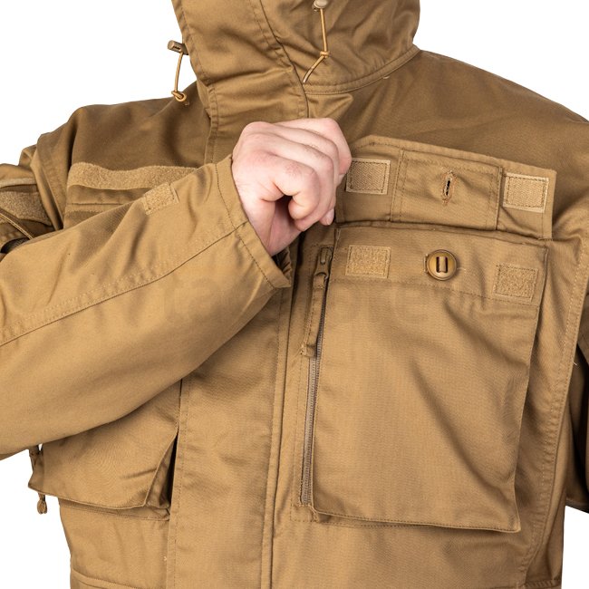 Parka Commando Pitchfork en couleur Coyote, taille XL. Veste robuste parfaite pour un usage militaire et quotidien. Matériau en PolyCoton durable avec capuche réglable, cordons de serrage et système de poche extensif.