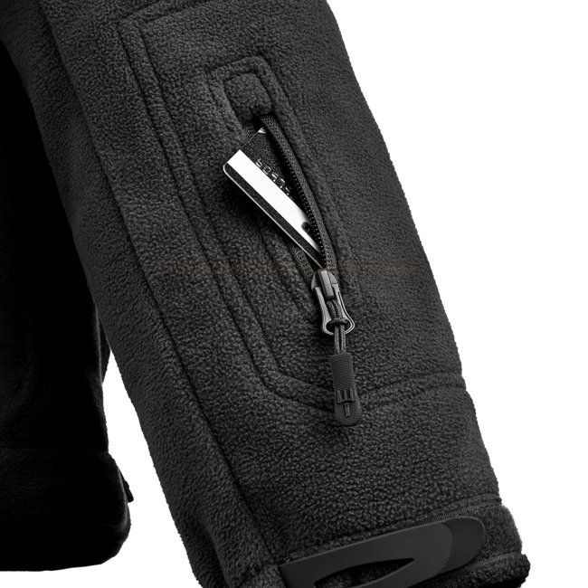 La veste peut être portée seule ou comme couche isolante sous une housse extérieure impermeable / coupe-vent. Grâce au matériau épais en double polaire et à la coupe spacieuse, il garde le porteur confortablement au chaud à tout moment. Les deux surfaces boucle & crochet sur les bras supérieurs ont une séparation verticale, ce qui permet au matériau de s'enrouler de manière ergonomique autour du bras.