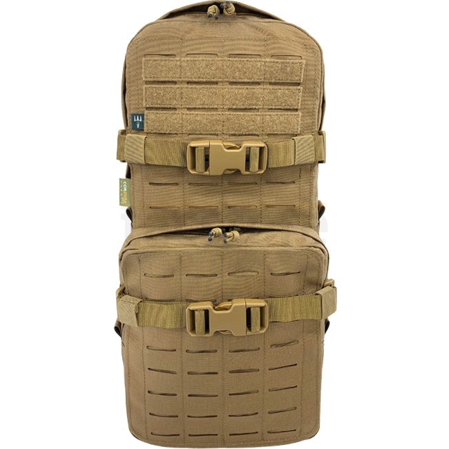Recouvert d'une surface laminée LaserCut sur trois côtés ainsi que de zones velcro pour les patches d'identification et de moral, il comporte des compartiments longs et minces à chaque côté. Ils peuvent contenir des antennes, des câbles, des chargeurs ou des outils nécessaires. Les compartiments sont ensuite recouverts de surfaces LaserCut pour fixer des poches supplementaires à base de MOLLE.