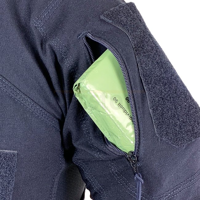 Sur les côtés et sous les bras, il est doté d'une maille légère, douce et respirante, qui assure le refroidissement nécessaire dans les situations chaudes. Sur les côtés, on trouve également des poches pour un smartphone ou d'autres objets plats. Les traversées de câbles permettent un acheminement dissimulé des écouteurs ou autres câbles. Les poches intégrées sur les bras supérieurs avec fermetures à glissière YKK ont également des entrées de câble des deux côtés. Du velcro sur les bras et sur la poitrine permet d’appliquer des patches de nom, des insignes de grade et d’autres.