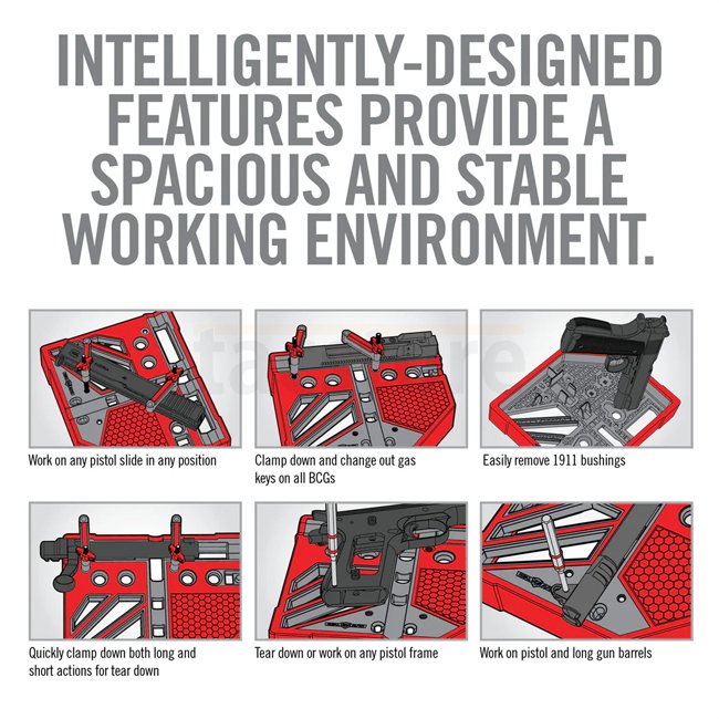Le kit associe un bench block de niveau master, un marteau ergonomique à têtes interchangeables et 18 chasse-goupilles en acier trempé pour accélérer le démontage et le remontage tout en préservant les finitions.