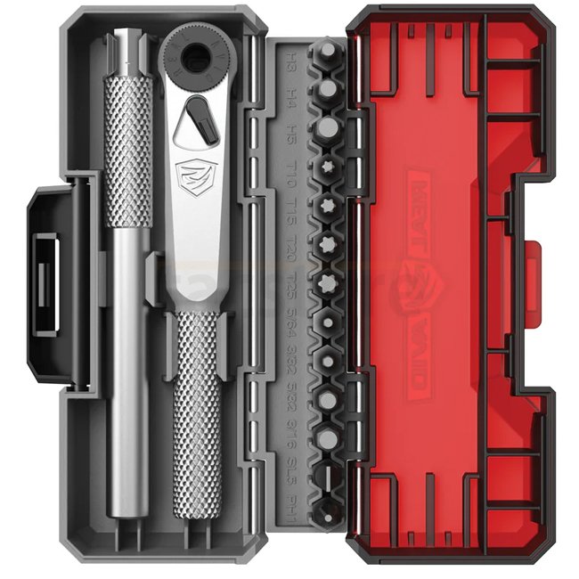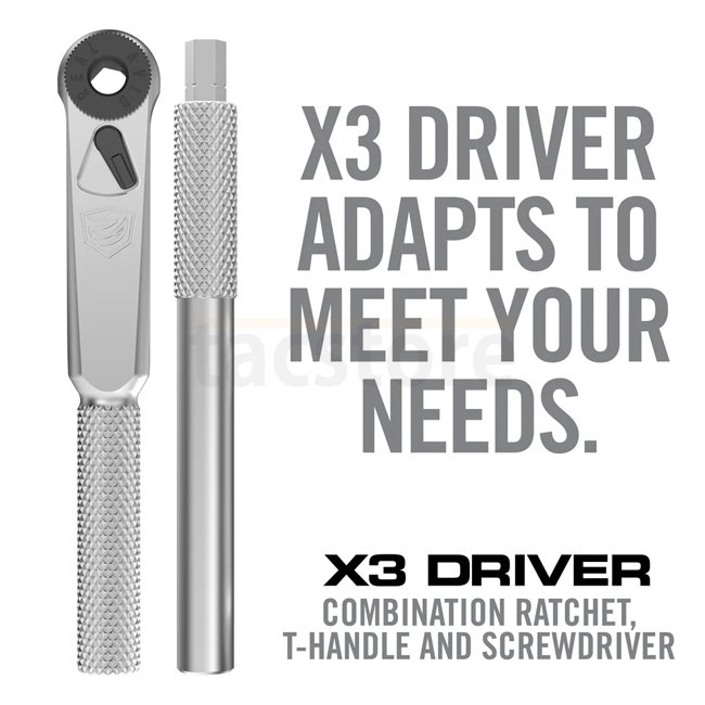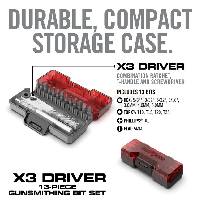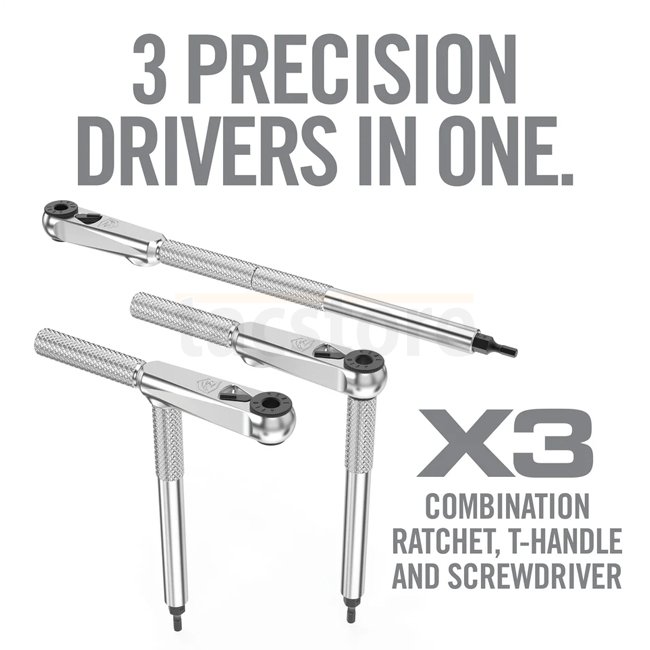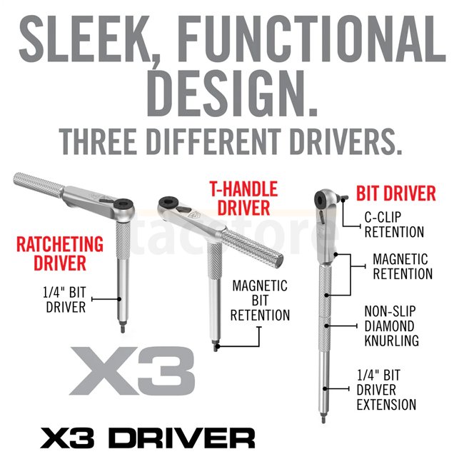 Ce set comprend le X3 Driver intégrant un mécanisme à 72 dents pour ratchet, une poignée en T pour plus de levier et une fonction tournevis. Poignée moletée ergonomique, rallonge de 10 cm et 13 embouts de précision – le tout dans un boîtier robuste et compact pour un transport aisé.