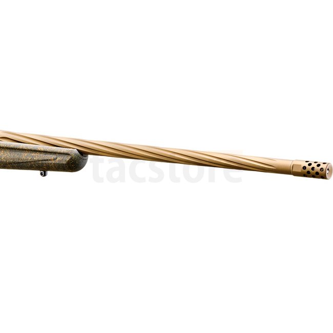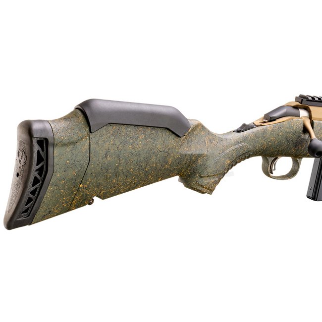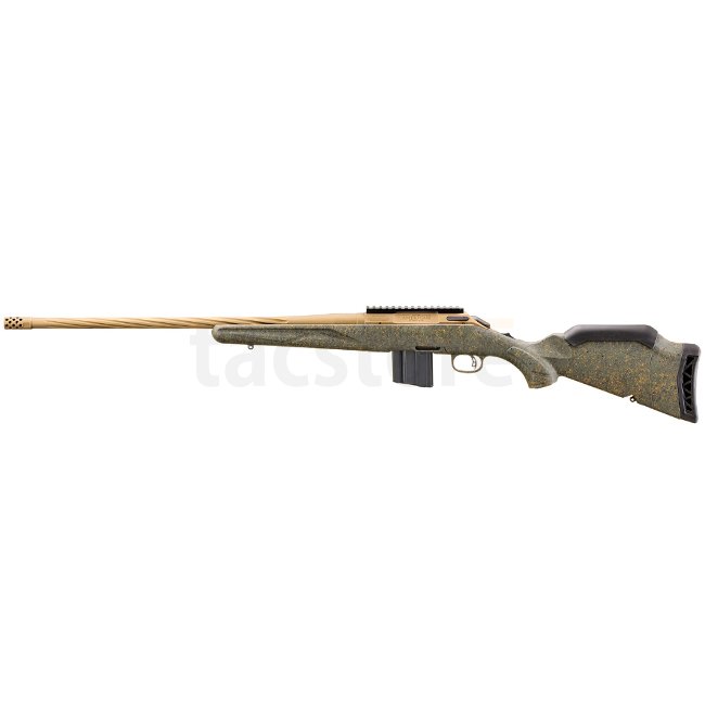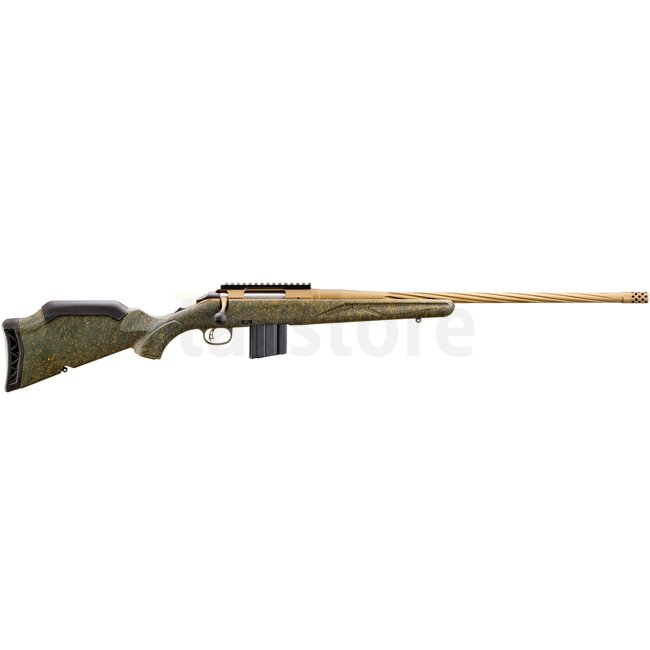 La Ruger Modèle 46940 en .22 ARC est équipée d’un canon spiralé de 559mm, d’un revêtement Burnt Bronze Cerakote® et d’une crosse synthétique Gen II verte Splatter. Le frein de bouche fileté et le système Power Bedding™ garantissent une stabilité maximale et une excellente précision.
