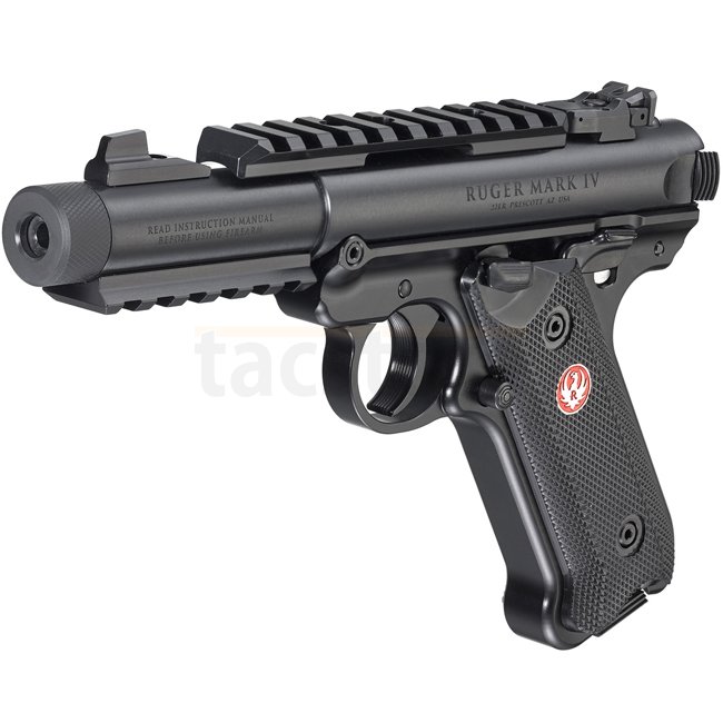 Le Ruger Mark IV combine la précision du .22 LR avec une conception adaptée aux accessoires modernes. Son canon fileté martelé à froid garantit des rayures précises et une grande durabilité. Le filetage 1/2-28 permet l’utilisation de Mündungsaufsätze standards. Des rails Picatinny intégrés en haut et en bas permettent le montage d’accessoires. Le cadre de poignée en aluminium est usiné CNC et équipé de plaquettes synthétiques quadrillées pour une prise en main fiable.